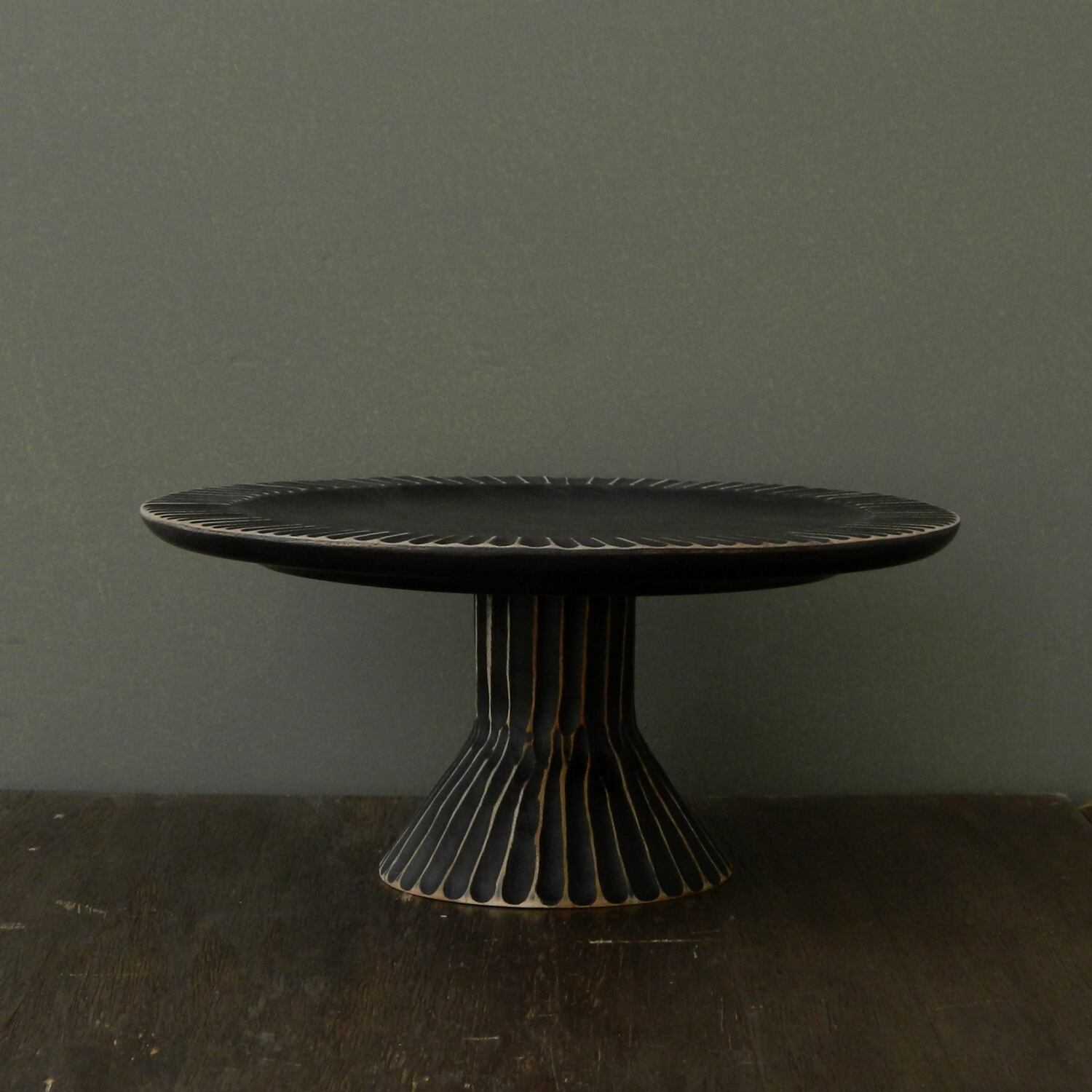 リムと脚全体につけられた彫りが無骨な感じでかっこいいケーキスタンド。