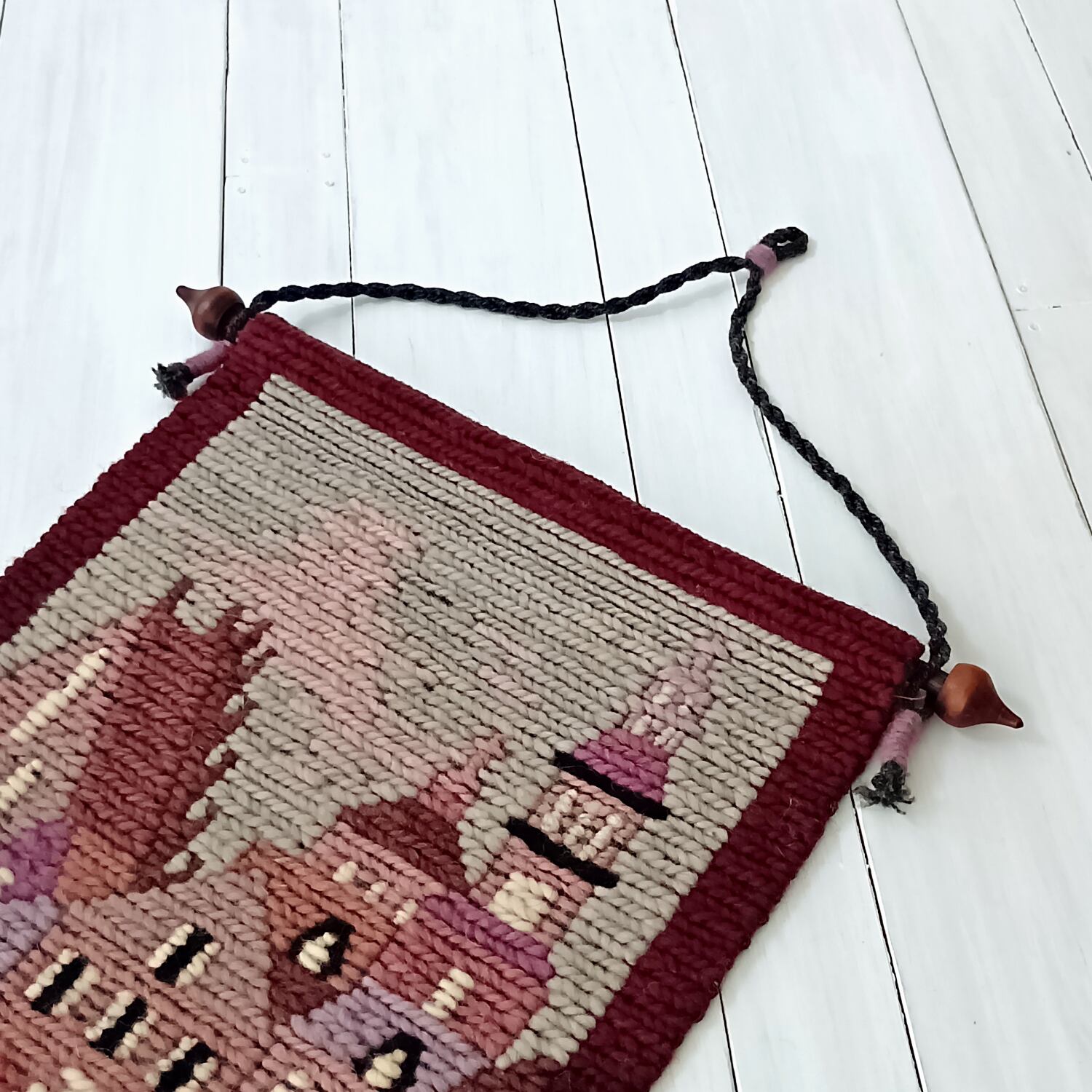 フリンジも吊り紐もウールで統一され木製の棒もストッパーまでデザインされまとまっています。