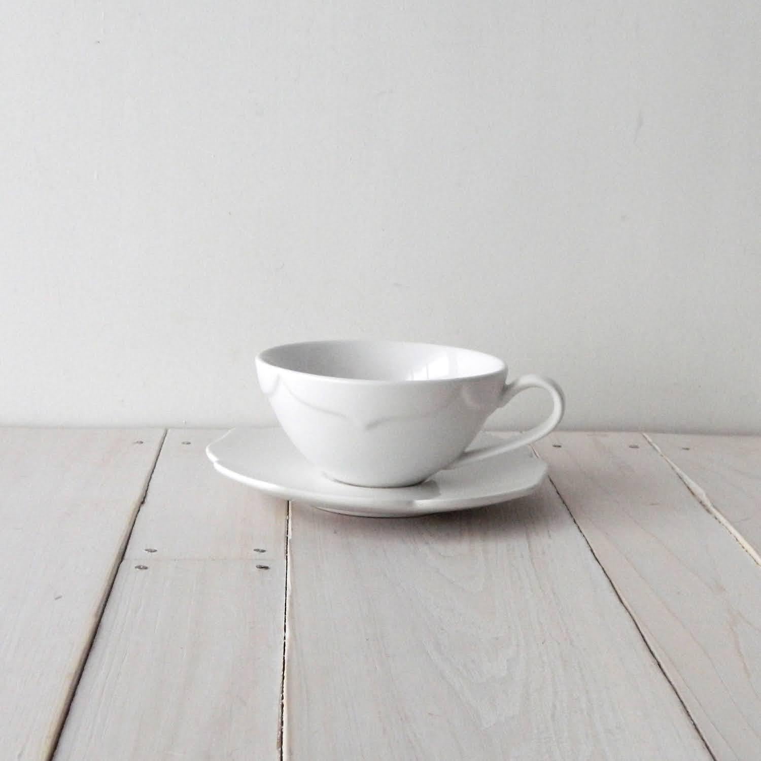 カップの側面のみマットな白になっていて花びらのような有機的なラインがカップにもソーサーにもデザインされています。
