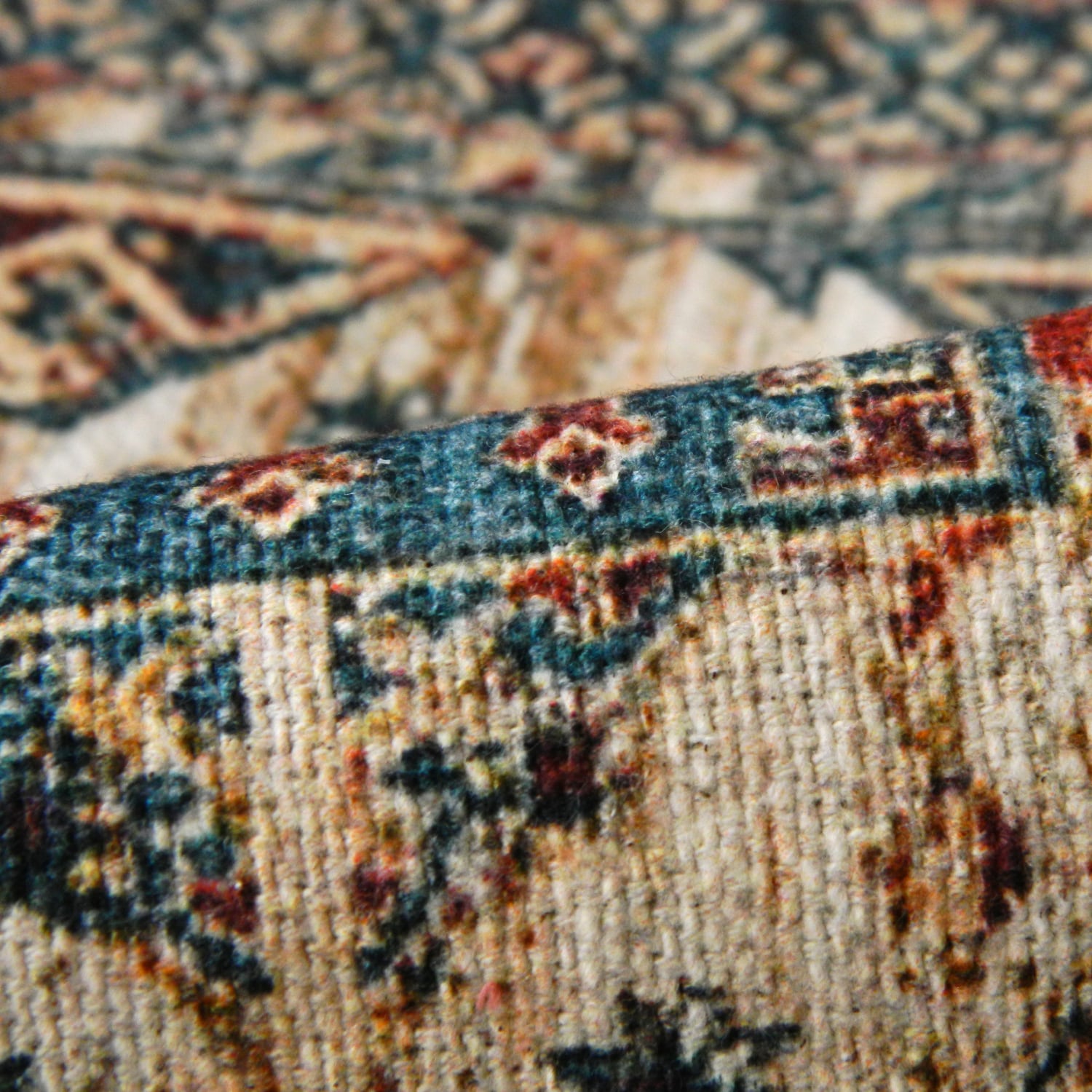 オリエンタルなラグの柄が活きるよう、甘めに織った厚手の平織生地にプリントされています。