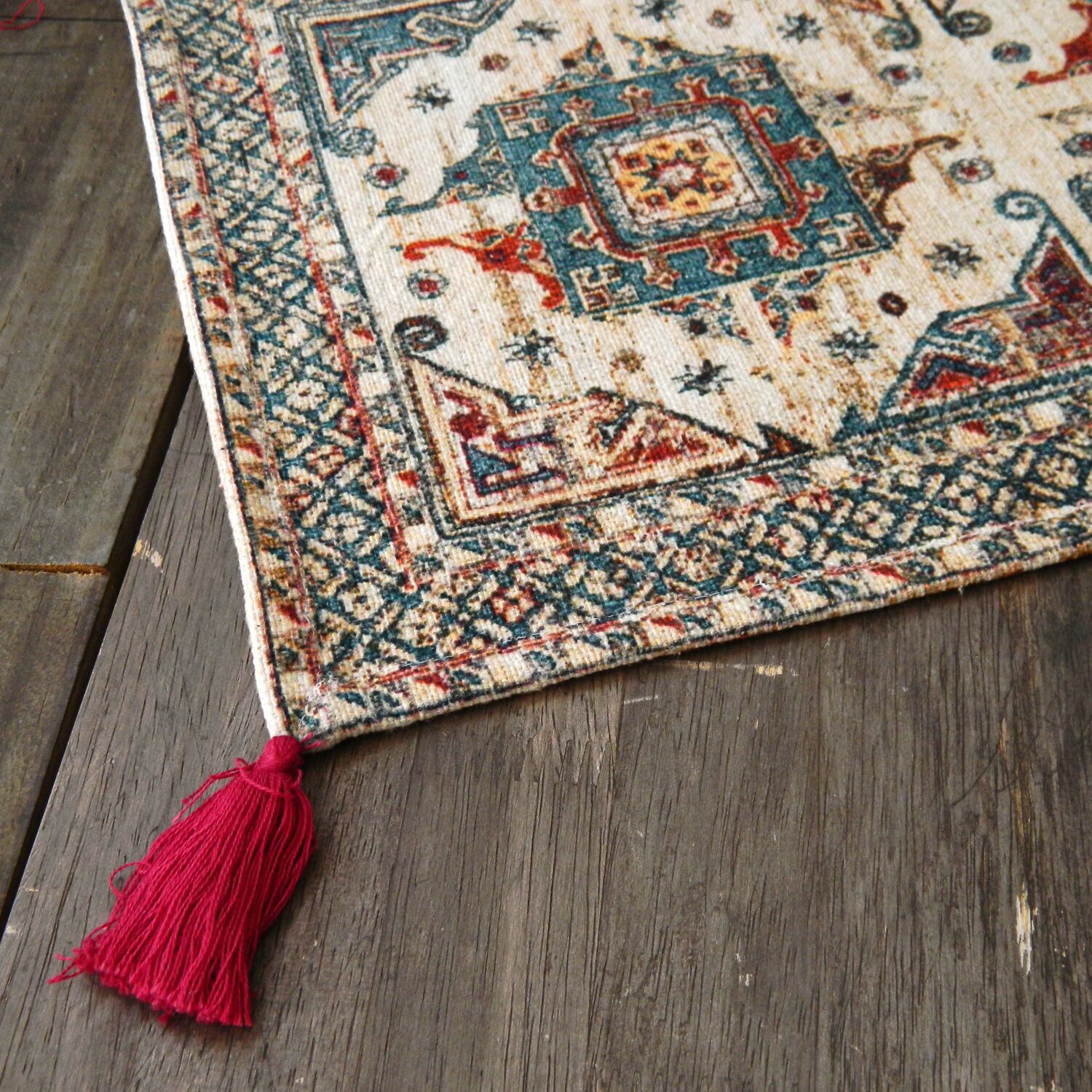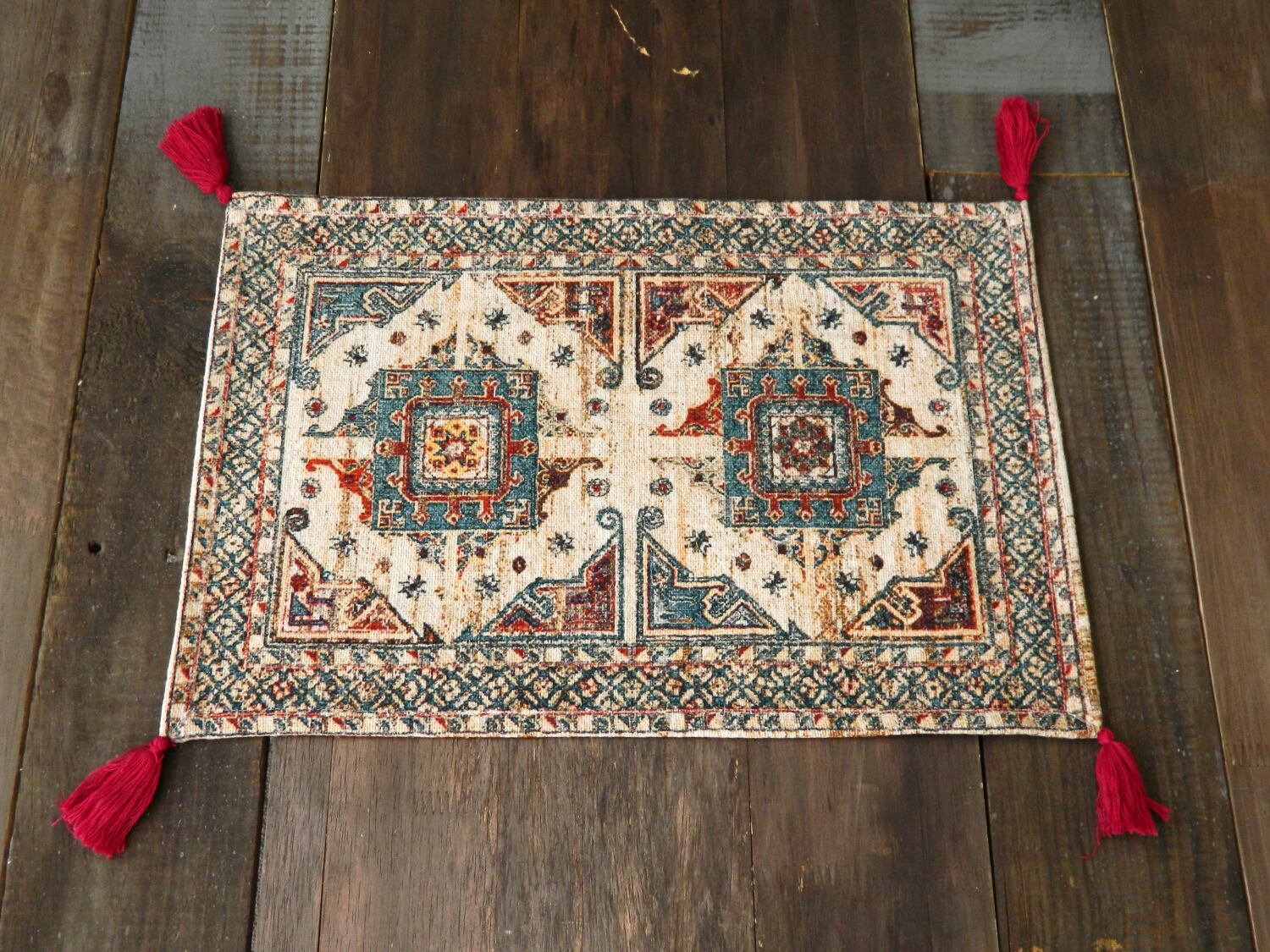 四隅についたタッセルが素敵なのでオブジェや花器などの敷物として使っても綺麗です。