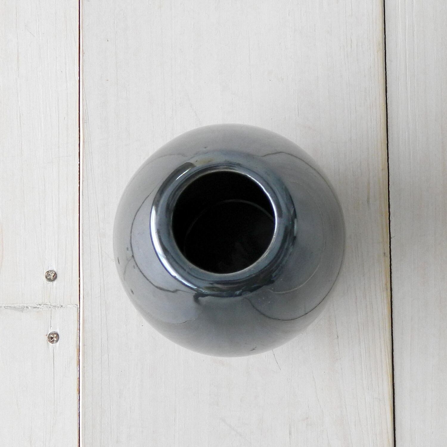 ネイビーのベースにミラーに少し虹色が入ったような玉虫色のコーティングがされたキラッと輝くフラワーベースです。