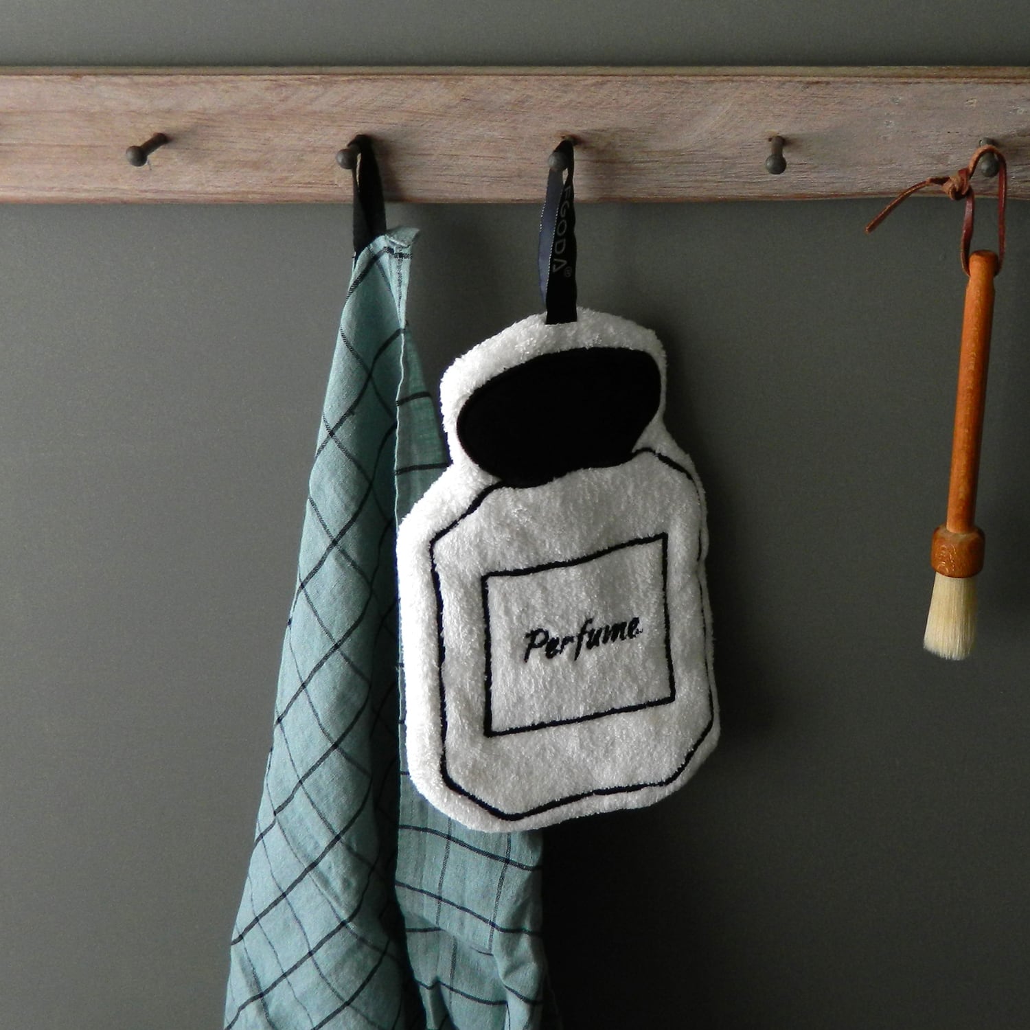 モノトーンカラーのパフィュームボトル型が大人っぽくかわいいので目に付く所にぶら下がっていても生活感が出にくく手が拭けてオススメです!